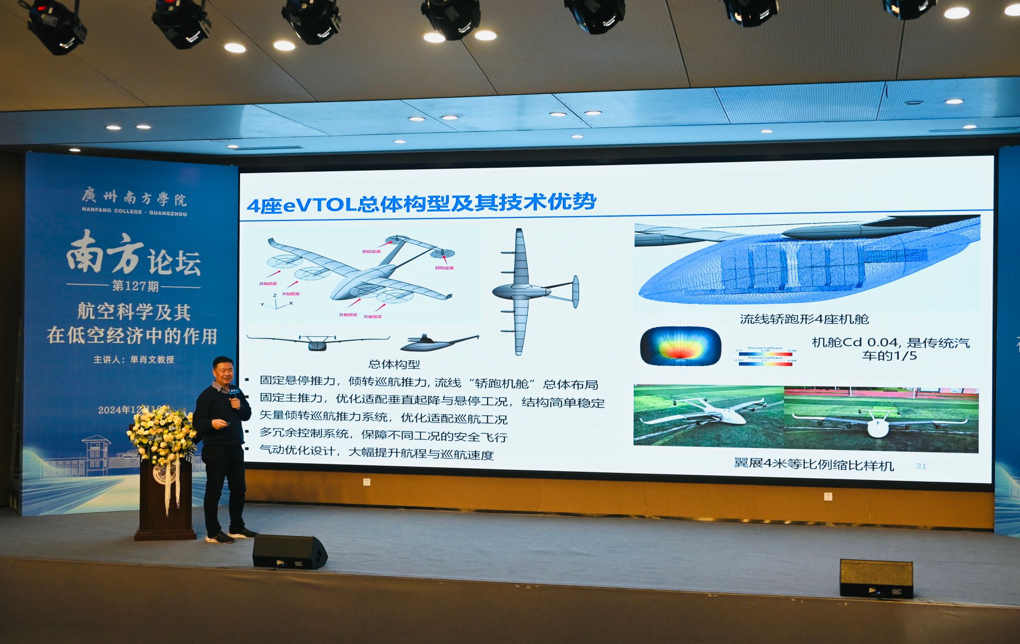“衡量一个飞行器的设计水平,关键在于风阻系数。风阻系数越小,设计水平越高。”单肖文教授说道。他列举世界各国高精尖飞行器不断优化的风阻系数,进一步指出技术创新对航空飞行器的重要作用。而在低空空域,肖教授谈到,各国加速研发及应用的eVTOL正让“打飞的”成为现实,“它使用高效电动驱动系统,以其独特的优势引领着新质生产力的深度发展,能够为解决城市交通拥堵、提高出行效率提供全新的解决方案。”