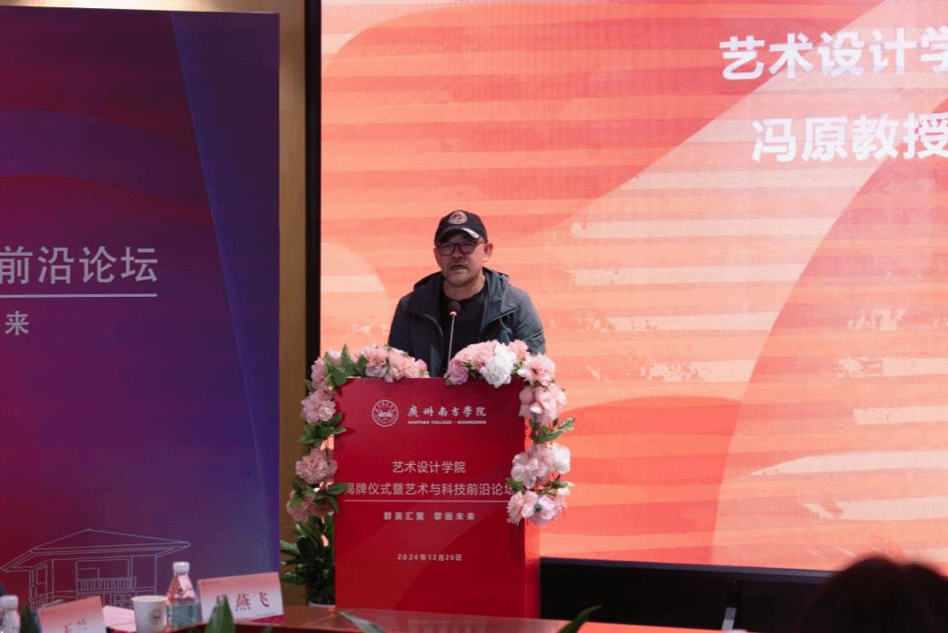 揭牌仪式后,艺术设计学院举行艺术与科技前沿论坛。曹雪教授在论坛中分享了广州城市标志、“你好,中国竹”“冰墩墩”等知名标志的设计经验与思考。他强调视觉心理和逻辑推导在设计中的重要性,认为设计不应局限于美学层面,还需注重策略与科学分析。曹雪教授表示,优秀的民族文化设计应深入挖掘传统文化内涵,而非简单的传统符号堆砌。他还以广州地铁站人性化设计、药品的创新包装设计为例,阐释了设计如何提升公共设施用户体验和增强产品市场吸引力,希望设计充分关注社会需求,通过设计为城市发展和人民生活做出贡献。