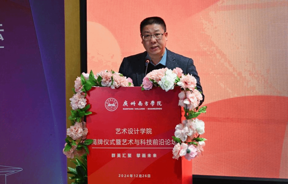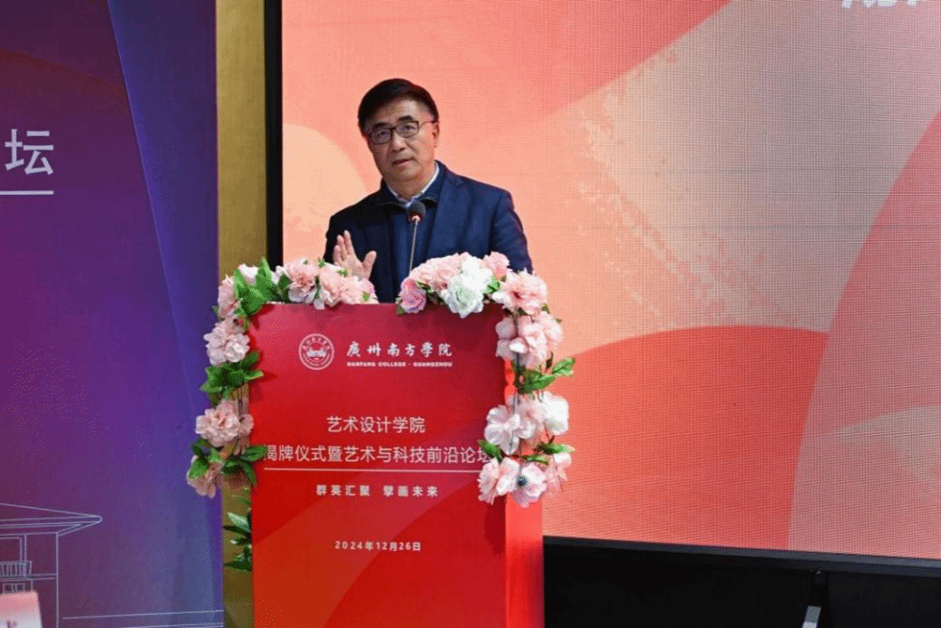 随后,艺术设计学院院长冯原教授发言,他首先向莅临此次活动的领导、嘉宾表示诚挚的欢迎与衷心的感谢。冯原院长回顾了艺术设计与创意产业系的发展历程,他表示,从最初仅有10余名教师的学系发展至今,学科专业设置完善,师资力量显著加强,学生规模稳步增长,整体实力和核心竞争力得到全面提升。他强调,学校成立艺术设计学院是学校强化办学特色、提升办学质量做出的决策部署,为进一步推动艺术设计等学科转型升级提供了新的发展机遇。他表示,学院将紧贴社会和市场需求,强化学科特色建设,创新学生培养模式,凝聚师资团队力量,推进艺术设计专业人才培养的高质量发展,向社会输送兼具家国情怀、国际视野的高素质艺术类应用型人才。