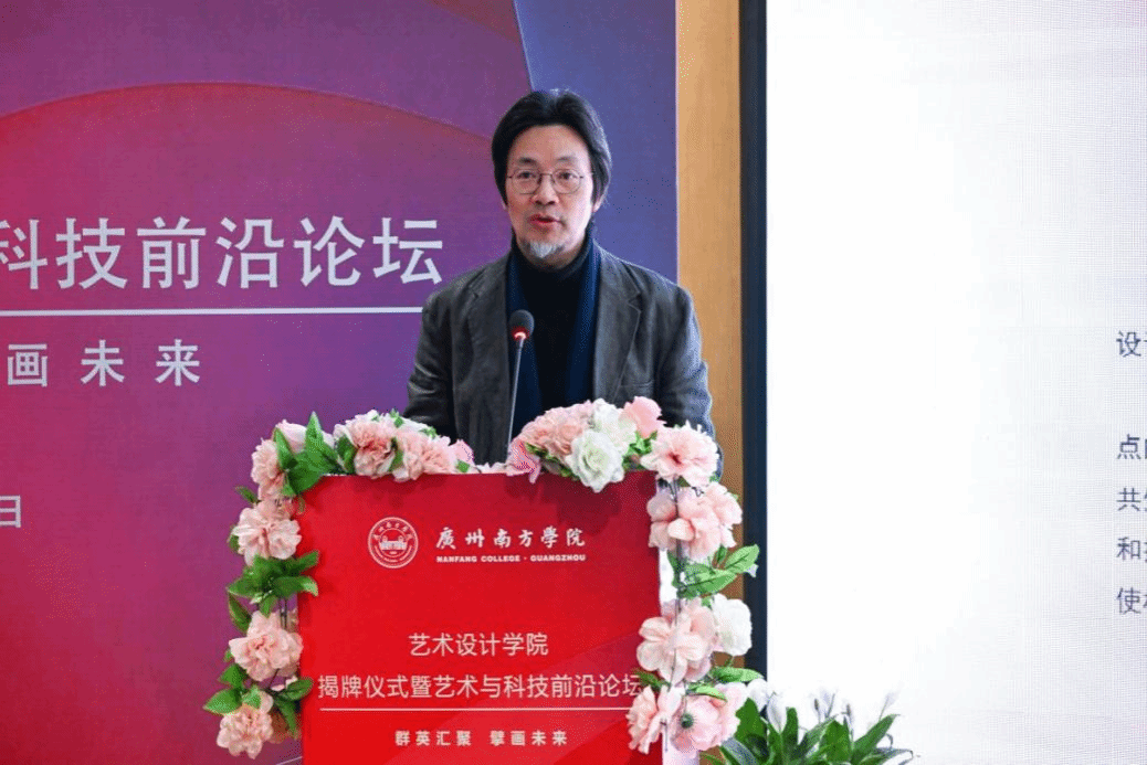 接着,特邀嘉宾曹雪教授致辞,他首先对艺术设计学院的成立表示热烈的祝贺。同时,他提出了对设计行业发展和艺术教育的思考,关于设计的“初心”与“内核”,他表示,面对人工智能的迅猛发展,设计行业应树立正确的危机意识,也应坚定文化自信、专业自信和行业自信,在科技浪潮中更应注重和保留艺术设计的“人性化”和“情感化”价值。