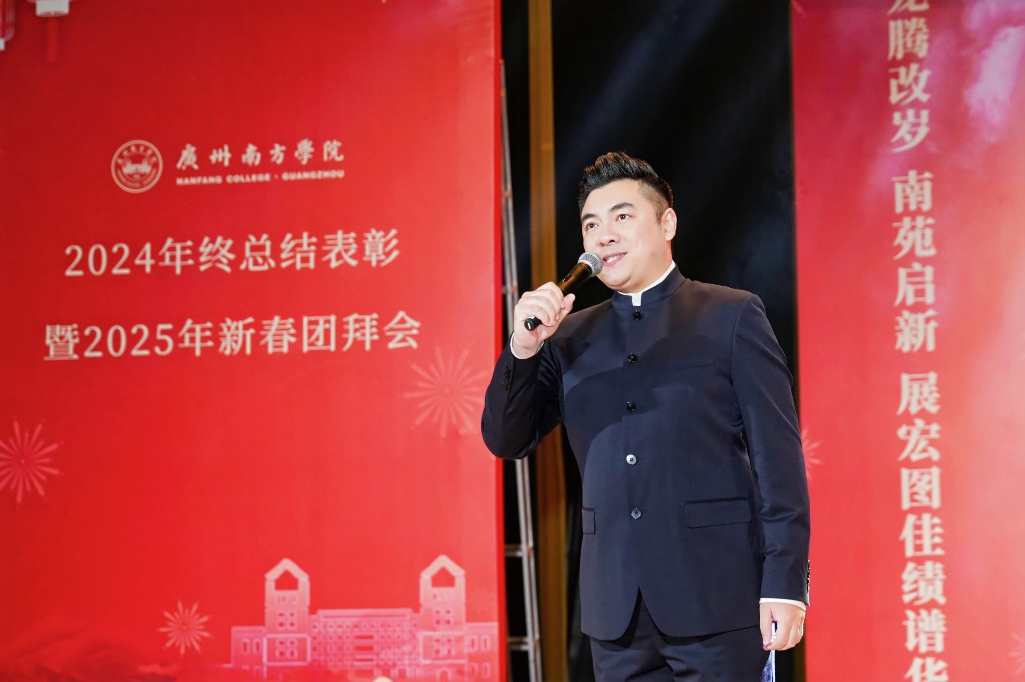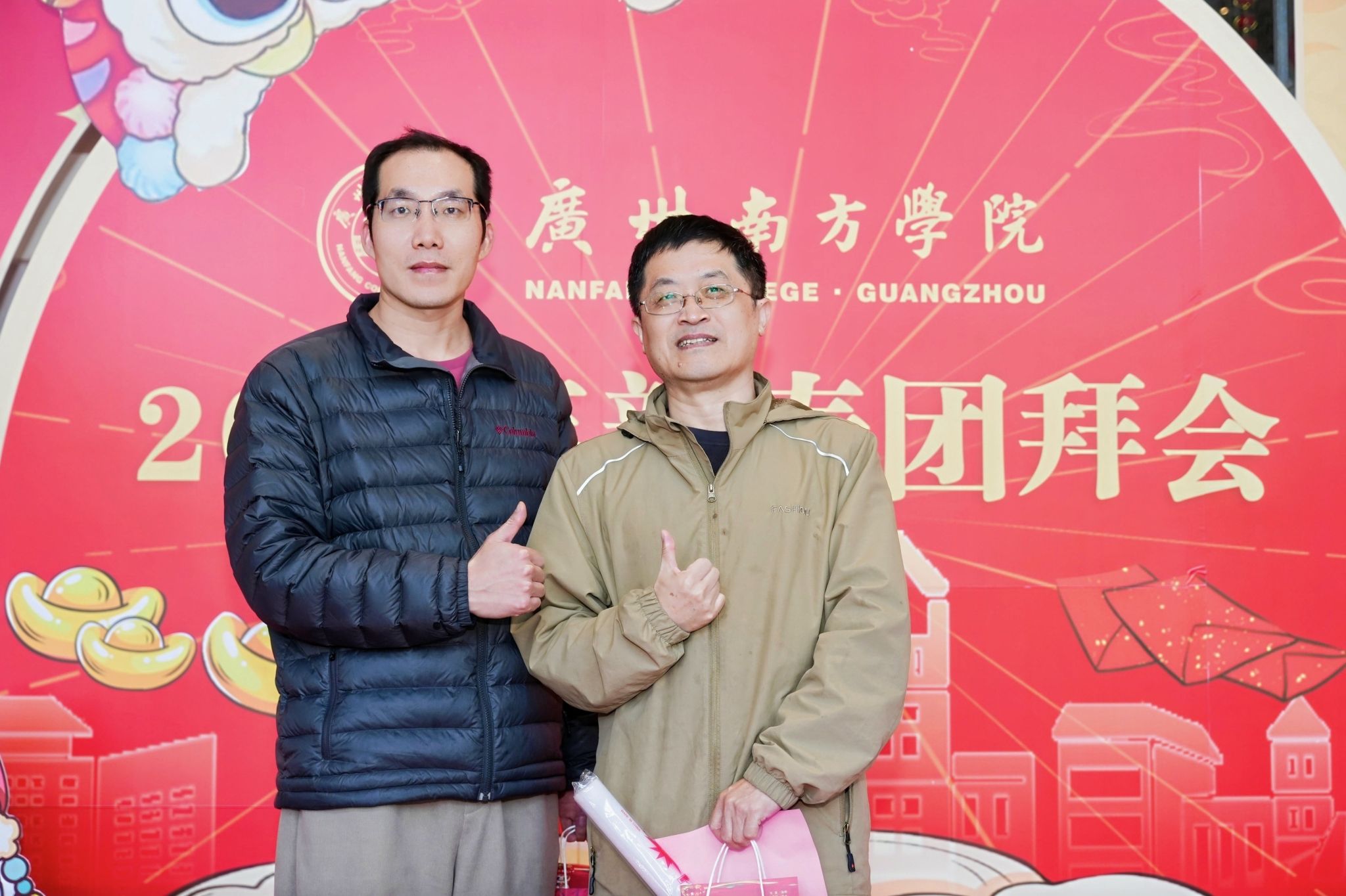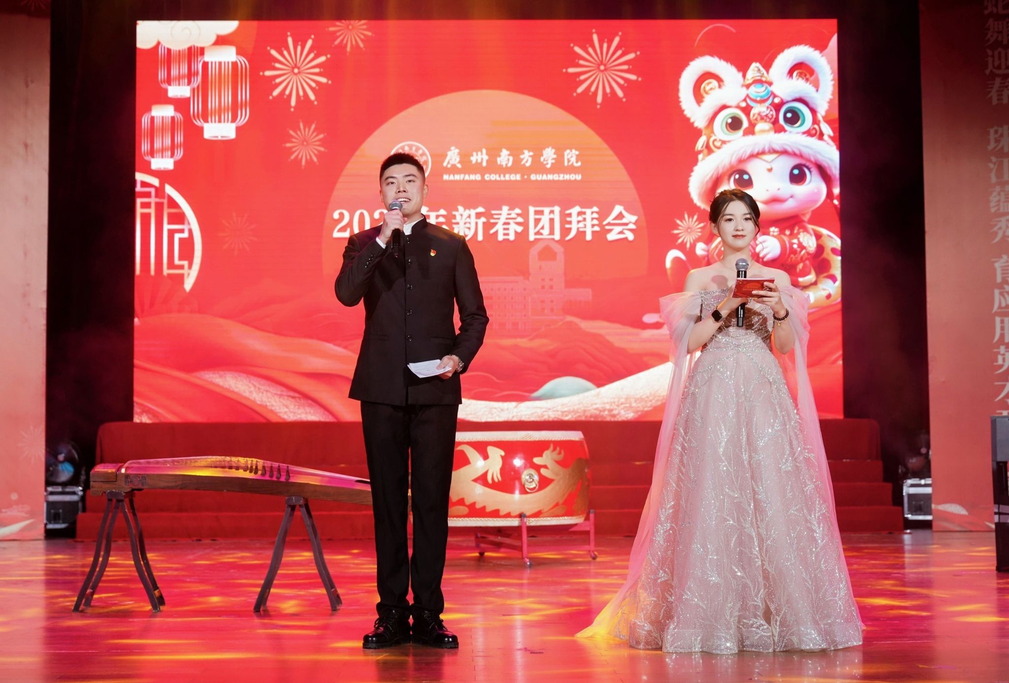 云康医学与健康学院老师吴泽豪(左)和学生处老师孙思瑶(右)主持新春团拜会