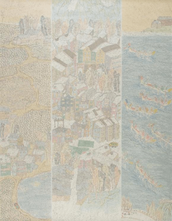 画作简介:《故里迴梦》这幅画高180cm,宽140cm。画的记忆中小时候的村里住址,90年代的老小区,邻里的小朋友连名字都没熟悉就一起穿街走巷疯跑,饭点各位妈妈喊遍大街小巷找自己的娃回家吃饭。村边还有一条渠,又细又短也不干净,但是节日氛围会拉满。