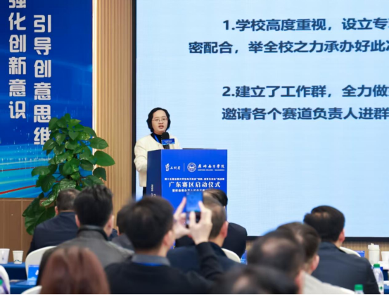 钟肖英教授代表广东赛区组委会向与会嘉宾汇报了三创赛前期准备情况,并详细介绍了赛事组织保障措施及关键时间节点,承诺将严格按照有效团队数比例,“公平、公正、公开”分配参赛指标,切实保障各高校参赛权益。