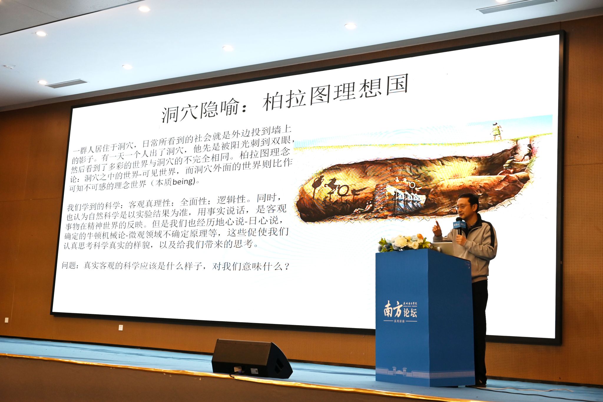 讲座伊始,王泉院士以古希腊哲学家柏拉图《理想国》中的洞穴隐喻为切入点,分析人类对世界的认知过程及其局限。他指出,科学作为人类探索自然、认识世界的重要手段,其本质并非固定不变,而是随历史发展持续演进。在此基础上,他向在座师生提出了一系列深刻问题:我们是否真正认识科学的本质?应以何种态度对待科学?在探索科学的道路上,又如何开展学习?