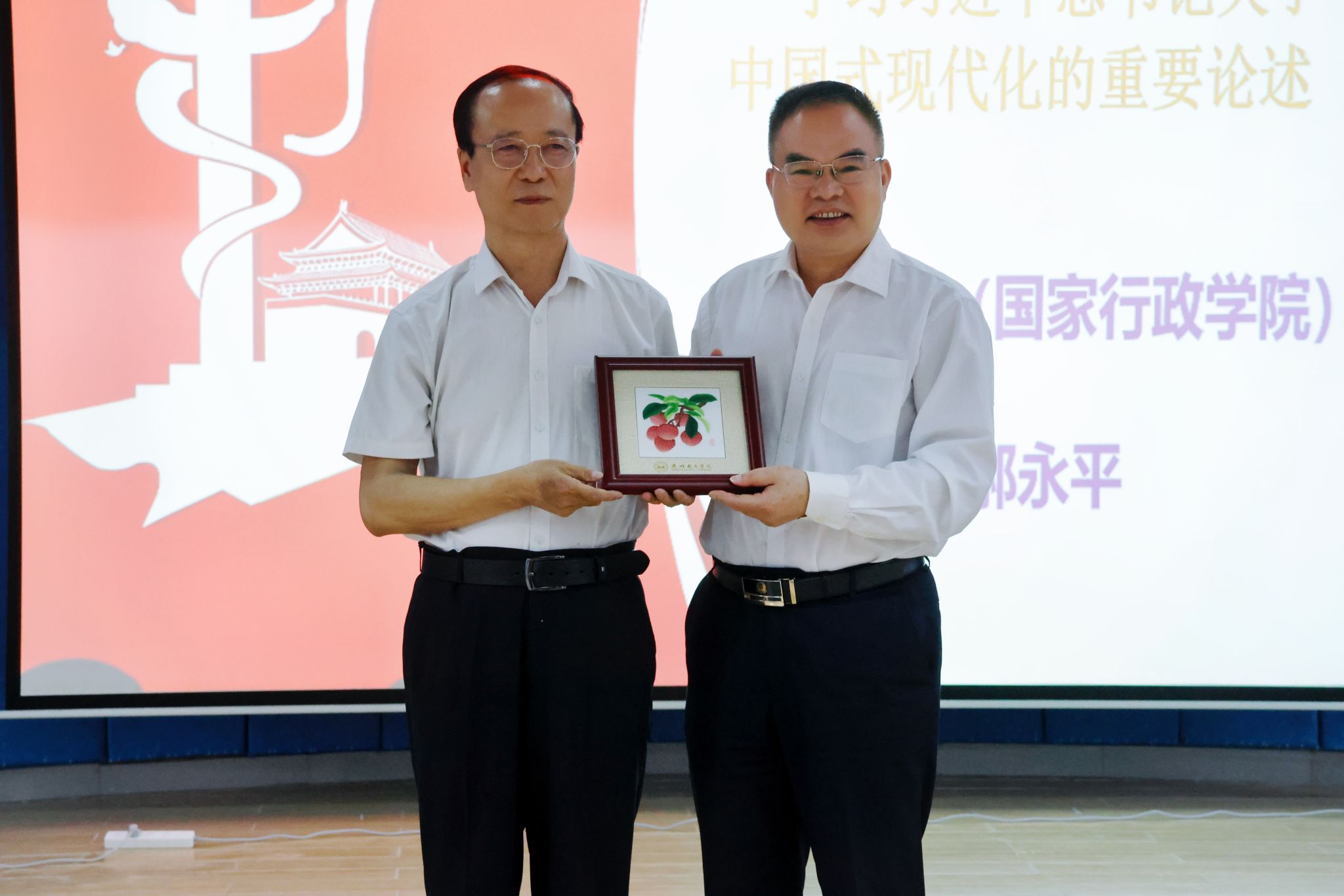 讲座尾声,植秀聪副书记、副校长向郝永平教授赠送学校纪念品—广绣《荔枝》。