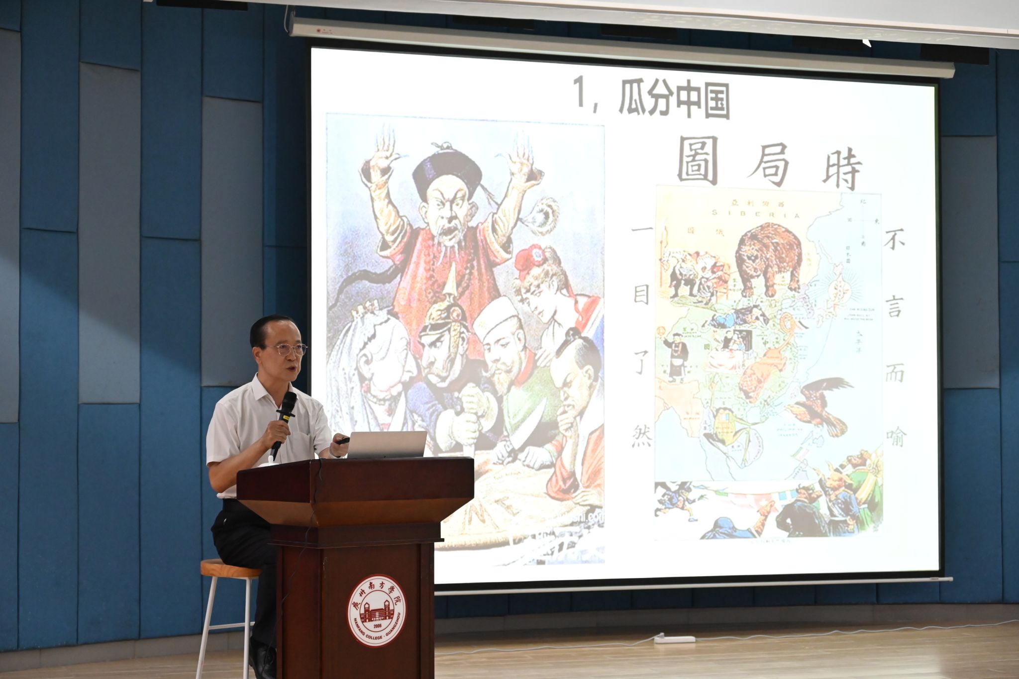 谈及现代化历程中的中西方发展路径差异,郝永平回溯历史,着重分析了晚清时期中国的发展困局。1840年鸦片战争到1949年中华人民共和国成立前夕,是中国逐渐沦为半殖民地半封建社会的历史。这一时期,在西方殖民主义对外扩张的过程中,近代中国遭受了悲惨屈辱的命运。为直观展现这段历史,郝永平引用中国近代时事漫画《时局图》,深刻展现19世纪末,尤其是中日甲午战争后,中国面临的被帝国主义列强瓜分的严重危机,在被动卷入现代化进程时的艰难处境。