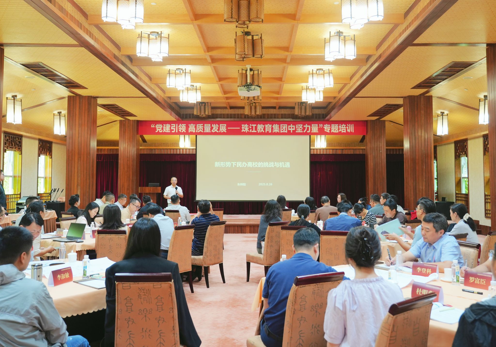 培训第二天,聚焦新格局下民办教育发展的现实挑战与创新实践,珠江教育集团联席总裁朱梓阳率先作《新形势下民办高校的挑战与机遇》主题报告,全面梳理了当前民办高校发展面临的主要困境,明确提出必须从规模扩张转向品质提升,系统性推动教育服务、信息化建设、产教融合与通识教育创新,以主动应变实现真正的高质量发展。