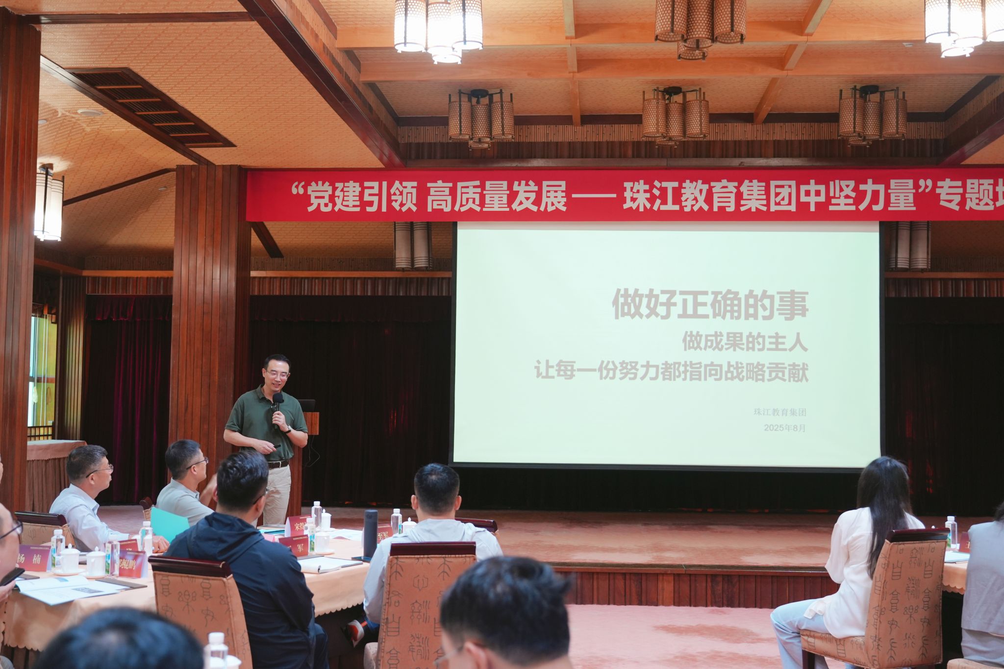 珠江投资集团首席人力官、珠江教育集团董事会秘书刘祥东就集团整体运行机制与人才发展体系作专题报告。他系统解读了珠江教育集团的发展战略布局、运营赋能体系及人才发展策略、理念,强调管理人员要明确角色和定位,结合战略目标有效推进工作,各高校应“力出一孔”,凝聚战略共识,增强行动合力,共同推动集团整体办学水平实现跨越式发展。