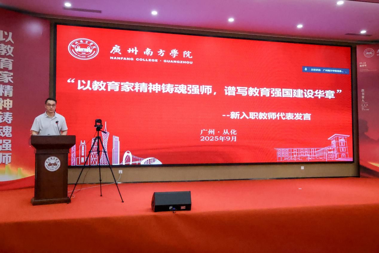 公共管理学院汤敏超老师作为新入职教师代表在大会上发言。他结合自身经历,分享了他对于教师这一新身份的理解。他表示,新入职教师应以“四有好老师”的标准要求自己,争取早日成长为一名合格的人民教师,为学校发展和人才培养贡献力量。