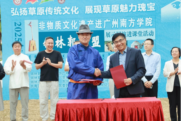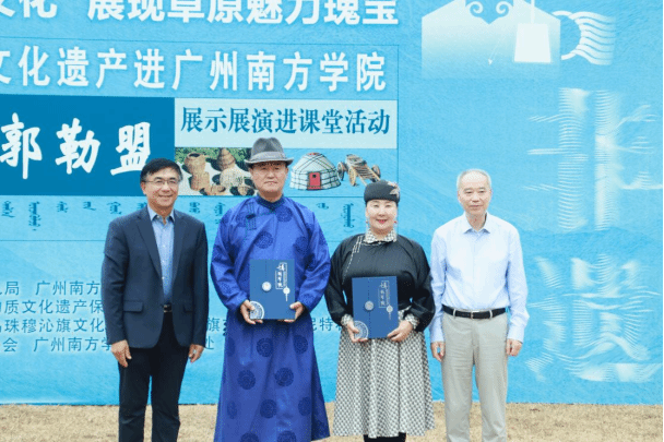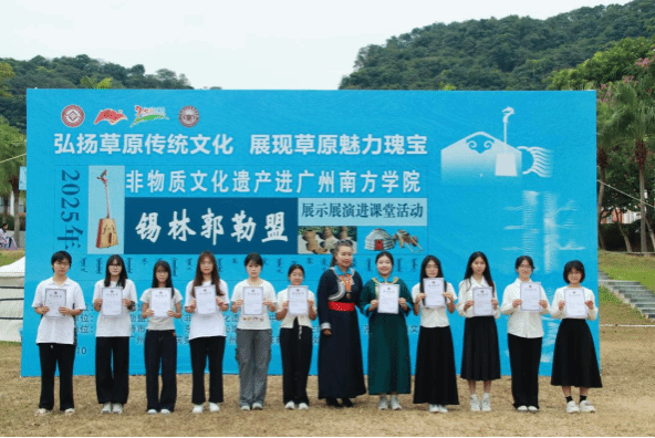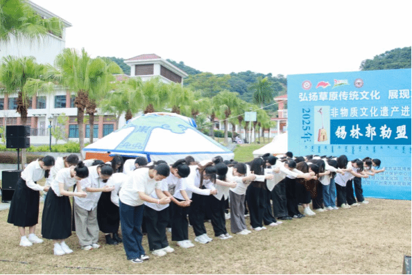 呼和那日苏馆长在讲话中充分肯定了本次“非遗进校园”活动取得的显著成果。他表示,本次活动是校馆协同育人的生动实践,让学生们得以系统学习并传习马头琴等非遗项目,亲身感受草原文化的魅力。他指出,本次成果展示并非终点,而是一个起点。期望同学们能成为非遗文化的从“学习者”转变为“传播者”,持续传播非遗魅力;期待校馆双方进一步深化合作,共同推动草原文化与岭南文化的交流互鉴与深度融合。