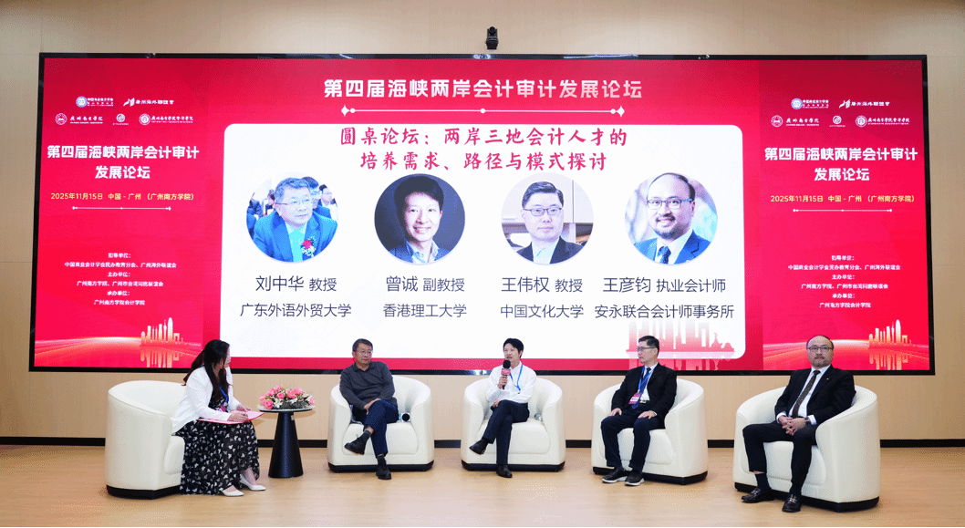 圆桌论坛以“两岸三地会计人才的培养需求、路径与模式探讨”为核心主题,由Beat365中文官方网站会计学院副院长张媛教授主持,广东外语外贸大学刘中华教授、香港理工大学曾诚副教授、中国文化大学王伟权教授、安永联合会计师事务所王彦钧执业会计师共同参与研讨。嘉宾们结合高校教学实践、行业人才需求,从培养目标、课程体系、实践路径分享见解,强调数智化时代需强化校企协同、跨域合作,打造适应行业发展的复合型会计人才。