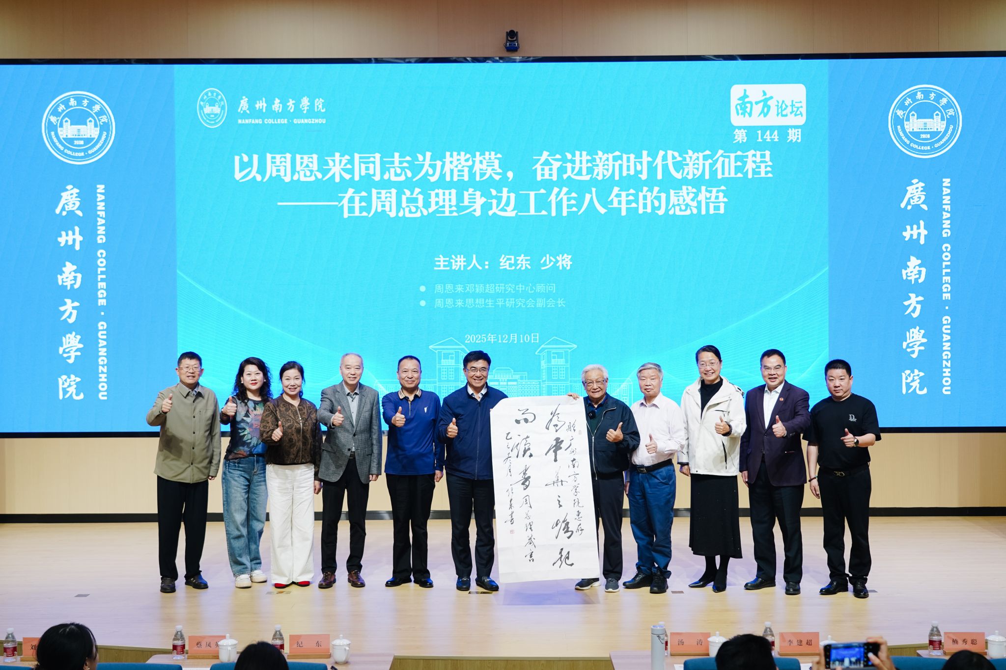 12月10日下午,南方论坛第144期在学校格致楼报告厅举行。周恩来邓颖超研究中心顾问、周恩来思想生平研究会副会长纪东将军担任主讲嘉宾,作题为《以周恩来同志为楷模,奋进新时代新征程》的讲座。中国中共文献研究会周恩来思想生平研究分会常务理事殷华研究员等一行人出席讲座。校长汤涛院士、党委书记李建超研究员等校领导,各教学单位、行政单位主要负责人以及师生代表共计400余人参加讲座,讲座由校长顾问、博雅学院院长张明远教授主持。
