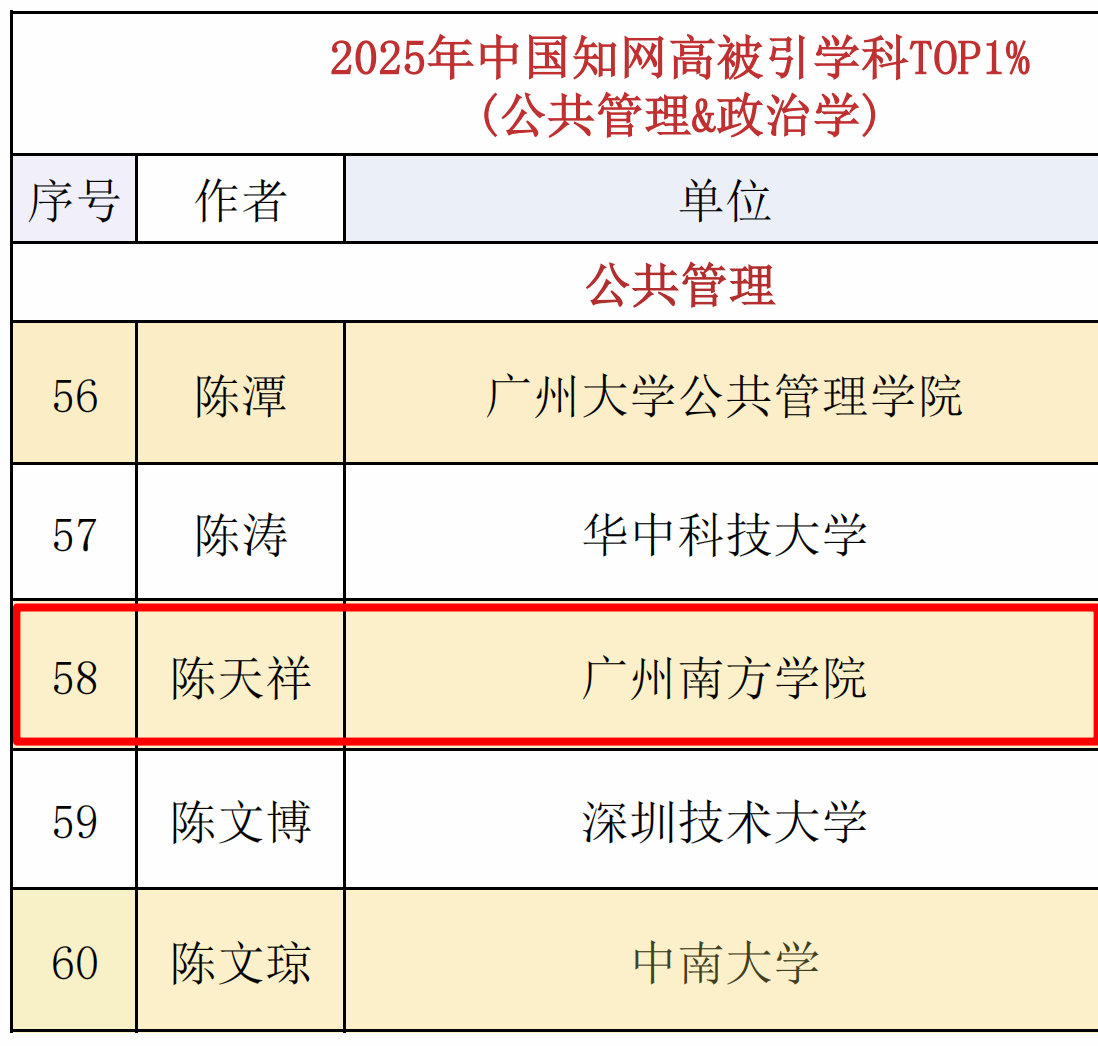 近日,中国知网(CNKI)旗下中国科学文献计量评价研究中心发布了“2025全国高被引学者”评选结果。Beat365官网公共管理学院院长陈天祥教授继2024年入选后,今年再度入选公共管理和政治学学科“高被引学者”TOP1%,充分体现其深厚的学术积累与持续扩大的学术影响力。