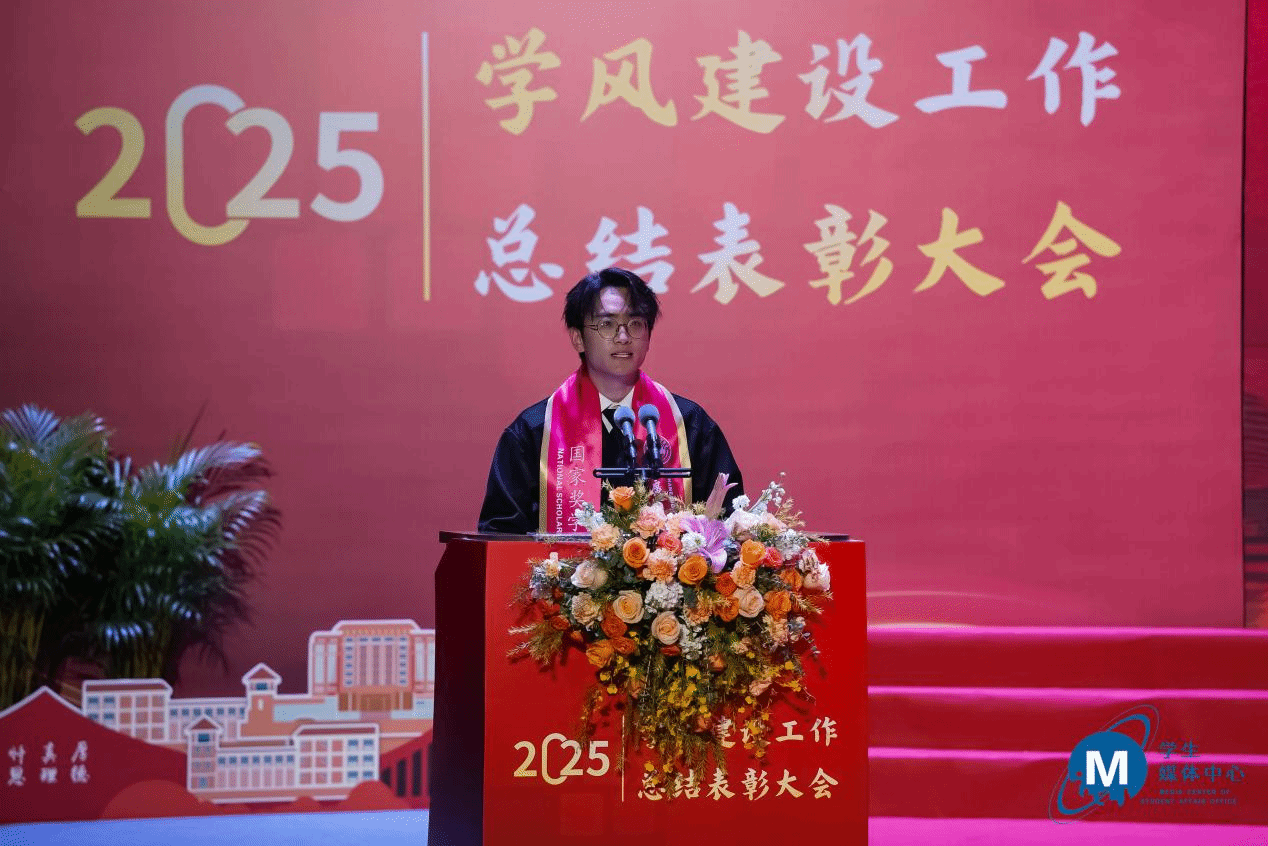 商学院2022级金融工程专业的赖晟涵同学作为2025年国家奖学金获得者代表发言,他分享了将专业所学投身乡村振兴的科创故事与成长感悟。他表示,比奖项更珍贵的,是在实践中读懂了“科技为民”的重量,懂得了青春的价值在于“帮他人走得多稳”,更锤炼了从“想做事”到“能成事”的本领。他感谢团队、师长与学校的培养,并呼吁同学们珍惜韶华、奋发有为,努力成为可堪大用的栋梁之才。
