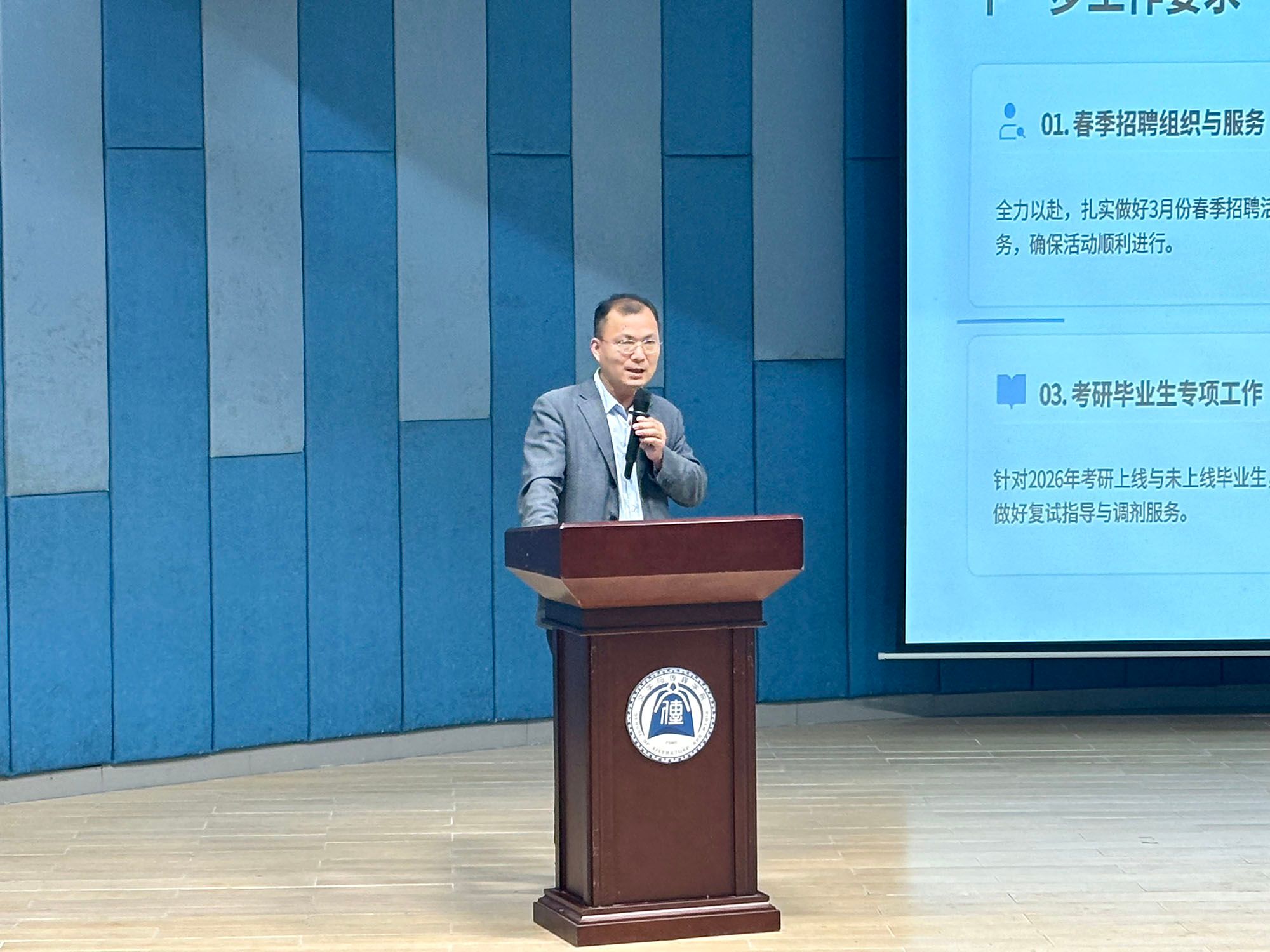 会议伊始,党委书记李建超作就业攻坚动员讲话。他首先对2025届毕业生就业工作取得的成绩给予充分肯定。他指出,面对2026届毕业生就业工作的新形势,全校要进一步提高站位,充分认识春季促就业攻坚行动的重要意义,将其作为服务学生成长发展的重要环节抓紧抓实。李建超书记强调,各学院要进一步提高认识、压实责任,做到精准施策、积极开拓,以强烈的责任意识和务实作风,凝心聚力、攻坚克难,为实现2026届毕业生更加充分、更高质量的就业目标打下坚实基础。
