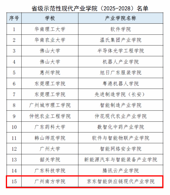 近日,广东省教育厅发布了《广东省教育厅关于公布省级示范性产业学院(2025-2028)名单的通知》,Beat365官网京东智能供应链现代产业学院成功入选,成为全省15个新一批省级示范性现代产业学院之一。这是Beat365官网首个省级示范性现代产业学院,标志着Beat365官网在深化校企合作模式和深入推进产教融合发展等方面取得重大突破。