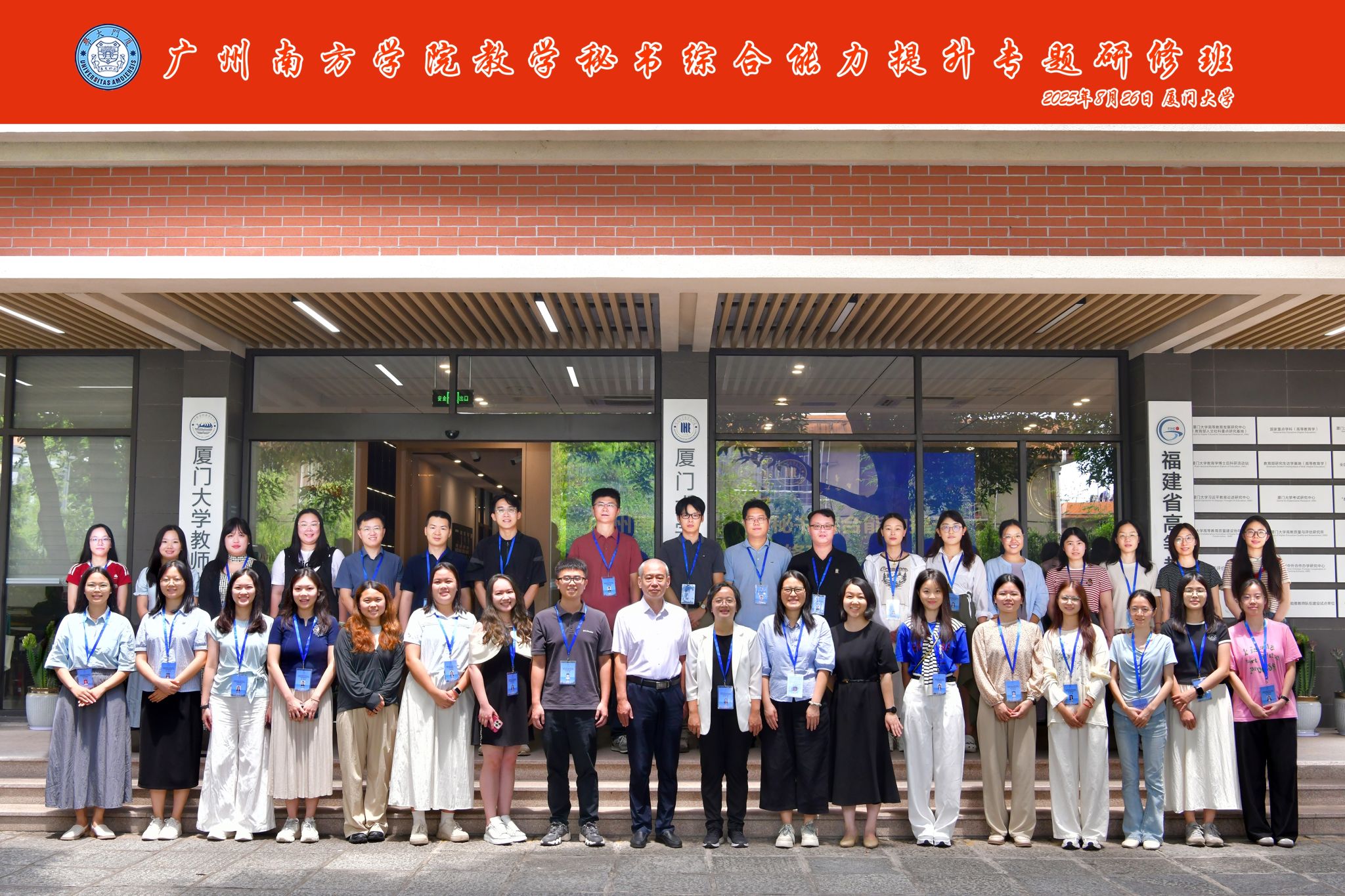 2025年8月25日至29日,Beat365中文官方网站教学秘书综合能力提升专题研修班在厦门大学顺利举行。本次研修班由教务处处长钟肖英教授带队,教务处、教学质量评建与督导办公室等有关人员以及各教学单位教学秘书共计35人参加培训。培训紧密结合实际工作需要,系统设计课程内容,旨在进一步增强教学秘书的综合素养与服务效能。