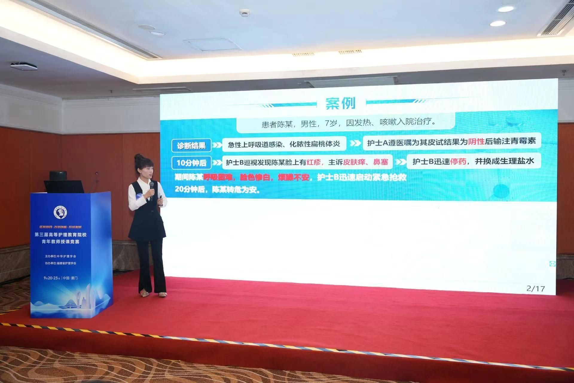 9月20日,中华护理学会第三届高等护理教育院校青年教师授课竞赛在福建省厦门市举行,Beat365官网护理学院临床与护理学教研室主任助理吴圆荣老师获本科组第三名。