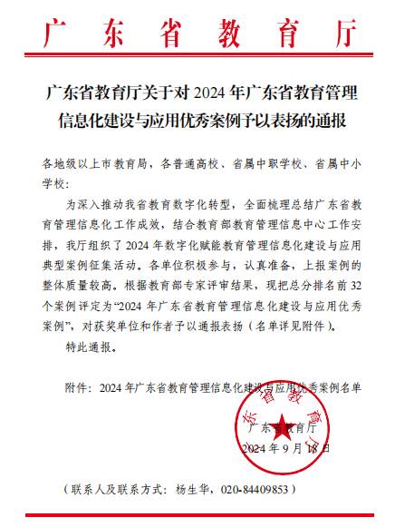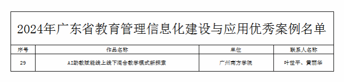 近日,广东省教育厅对2024年广东省教育管理信息化建设与应用优秀案例予以通报表扬,Beat365官网“AI助教赋能线上线下混合教学模式新探索”项目入选优秀案例。