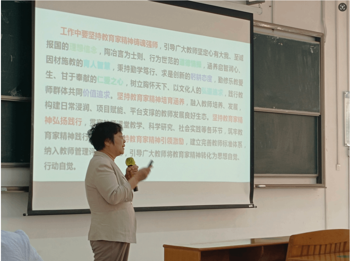 在分享对教师职业的理解时,宋粉云教授结合学校的发展阶段,深刻阐述了教师们的使命和责任。她指出:“教师是立教之本、兴教之源,强国必先强教,强教必先强师。没有教师的高质量,就谈不上教育的高质量。”她鼓励教师们深刻理解和承担教师职业的使命责任,大力弘扬教育家精神,将教育家精神转化为行动自觉。