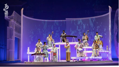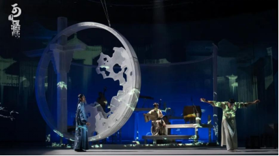 林芷羽表示,实验国乐剧《可园可源》在舞美设计上的灵感来自于“可圆”与“可源”中的“圆”、“源”二字。团队融合了岭南可圆与十香园的建筑元素,旨在设计出一个具有极简中式风格的舞台装置,在有限的空间内呈现岭南园林的风貌。为实现这一目标,团队经过多次调整设计,最终确定以圆心为设计核心,构建出一个层层展开的四层圆形舞台空间,为整个舞台增添了一份诗意。当演员们在这样的舞台上表演时,他们仿佛与舞台融为一体,使每一幕都成为一幅精美的画卷,在观众面前缓缓展开。