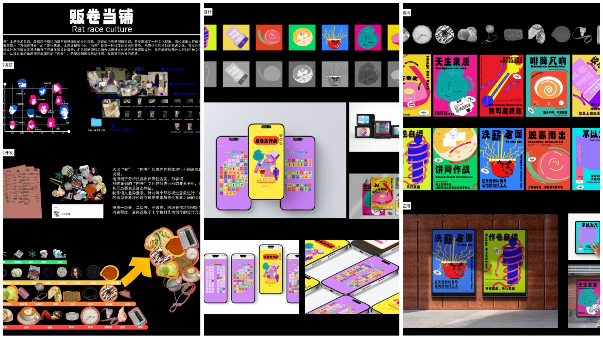 作品简介:“内卷”原是描述内部不断精细化的文化现象,而在当今社会却成了过度追求与无意义竞争的代名词,作者通过人群调研确定“内卷”感性意像的词汇与意像物品,设计系列贩卖内卷的海报以及开发一款H5的小游戏,从设计与互动的角度回应非理性的“内卷”。