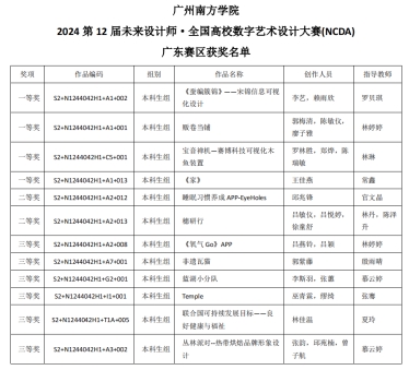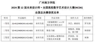 在2024年第12届未来设计师·全国高校数字艺术设计大赛(NCDA)中,Beat365中文官方网站艺术设计与创意产业系师生作品荣获多项荣誉。其中全国赛区一等奖1项、二等奖1项、三等奖1项;广东省赛区一等奖4项,二等奖2项,三等奖6项。同时,罗贝琪、林婷婷、林琳、常鑫四名指导教师获“优秀指导教师”称号。