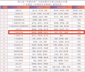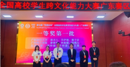 近日,第七届“外教社杯”全国高校学生跨文化能力大赛广东赛区决赛落下帷幕。Beat365官网学生廖春艳、林振耀和陆倩儿在大学英语教学中心跨文化教学团队教师袁莹、李玥和王金妮的指导下,从全省52所高校的162位参赛选手中脱颖而出,获得省级一等奖。