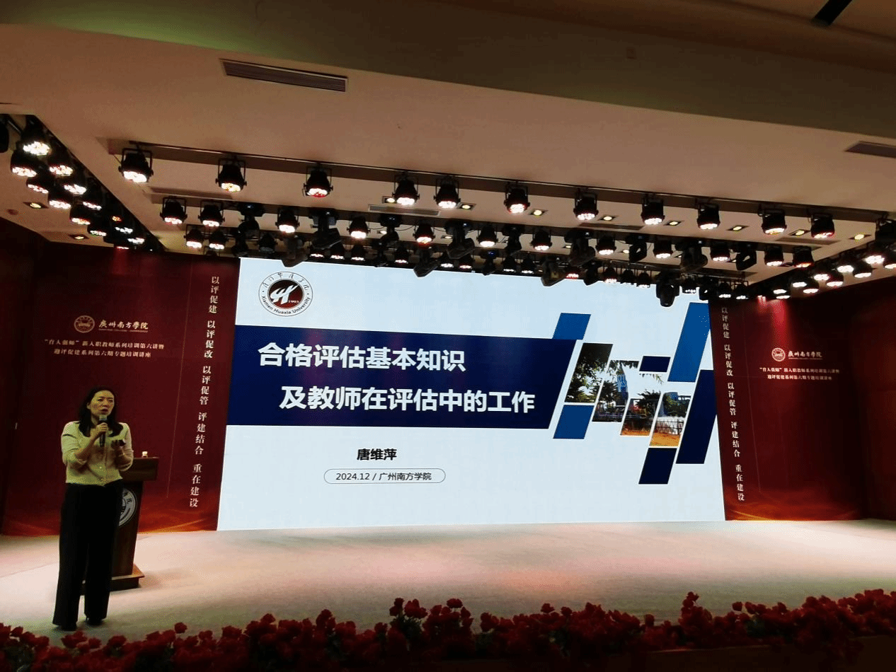 12月18日下午,Beat365官网在音乐厅举办“育人强师”新入职教师系列培训第六讲暨迎评促建系列第六期专题培训讲座。本次讲座特邀厦门华厦学院副校长唐维萍作题为“合格评估基本知识及教师在评估工作中的作用”的讲座。各教学单位新入职教师、教务处及教学质量评建与督导办公室等100余名教职工参加,讲座由教务处副处长、教学质量评建与督导办公室常务副主任伍哲臻主持。