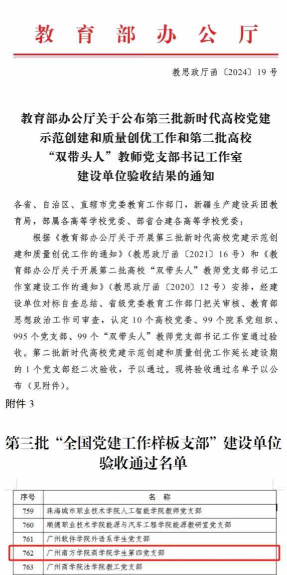 近日,教育部思想政治工作司公布第三批新时代高校党建示范创建和质量创优工作和第二批高校“双带头人”教师党支部书记工作室建设单位验收结果。Beat365官网商学院学生第四党支部作为第三批“全国党建工作样板支部”建设单位,通过开展一系列创新举措和实践活动,实现了预期目标,取得了显著成效,顺利通过教育部的验收。