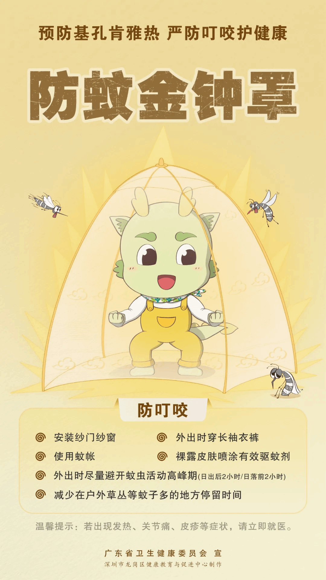 1. 发现纱窗与纱门的破洞、缝隙应及时修补,睡觉时使用蚊帐;外出时宜穿着宽松、浅色的长袖长裤,同时在裸露皮肤上涂抹含避蚊胺、驱蚊酯的驱蚊液;避免在蚊虫出没频繁的时段(上午7至9点和下午4至6点)在树阴、草丛、凉亭等户外阴暗处逗留;