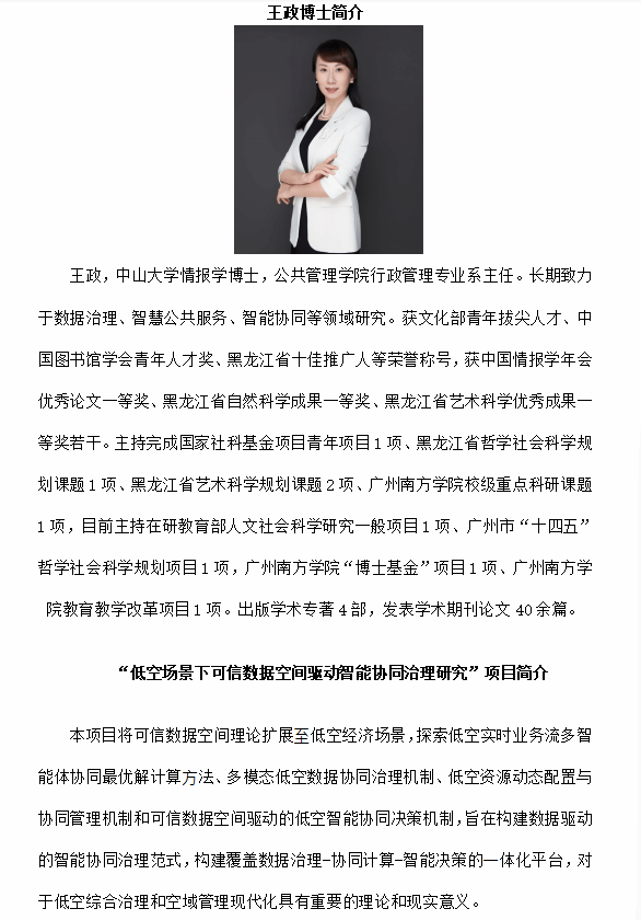 近年来,随着申报数量的逐年增长,教育部人文社会科学研究项目评审标准愈发严格。此次立项不仅是王政老师在“低空场景治理”“可信数据空间”领域研究实力的体现,也展现了学校人文社会科学研究的创新潜力。