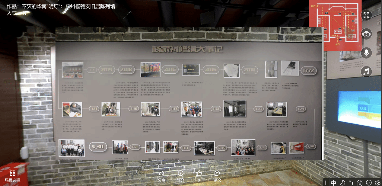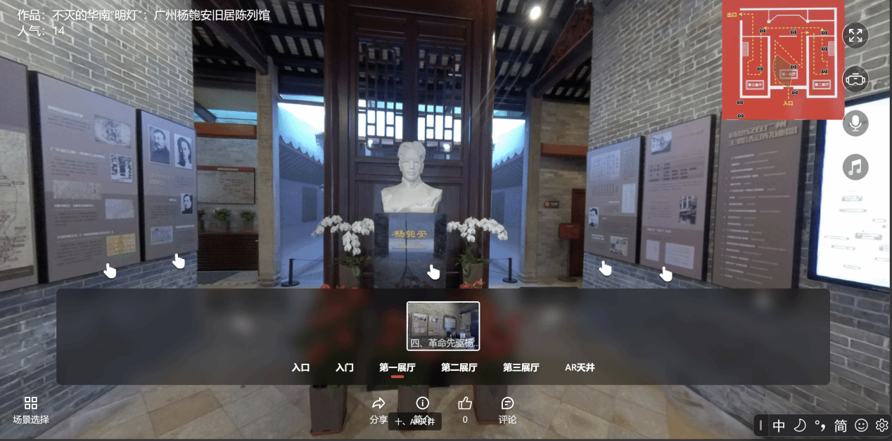 作品聚焦华南地区马克思主义传播先驱杨匏安同志的革命足迹,以广州杨匏安旧居陈列馆为核心拍摄区域,通过全景技术,复刻了这座百年祠堂的红色风貌。作品涵盖杨匏安书房场景、VR复原的后座天井以及红色据点历史陈列区,带领观众沉浸式走进历史现场。作品以科技赋能红色文化传承,在虚拟全景中实现了对革命精神的可视化、情境化表达,具有显著的教育意义与艺术价值。